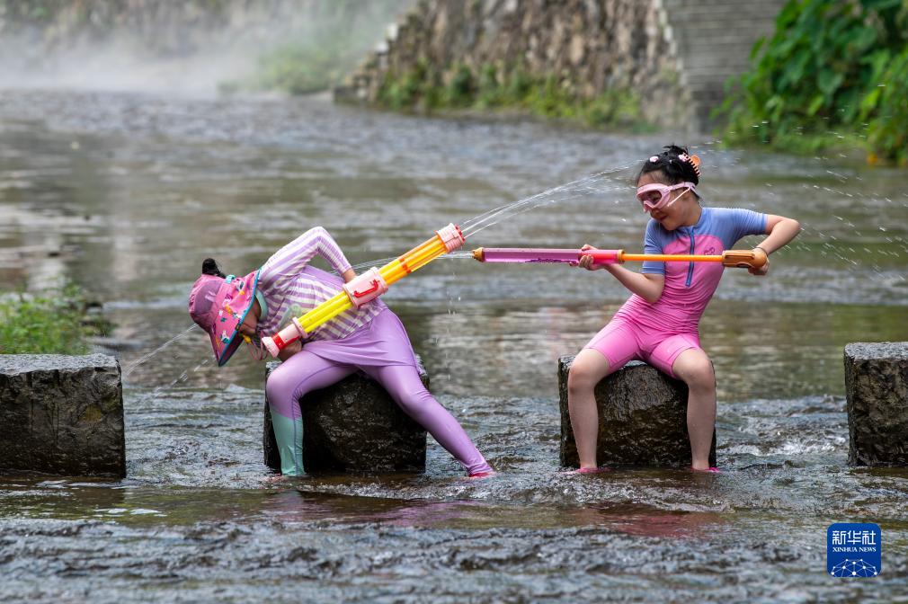 8月5日,在浙江省金华市磐安县安文街道花溪村,两名孩子在嬉水。