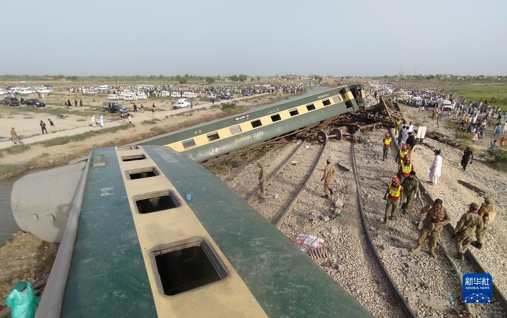 这是8月6日拍摄的巴基斯坦南部信德省桑克尔地区列车脱轨事故现场。