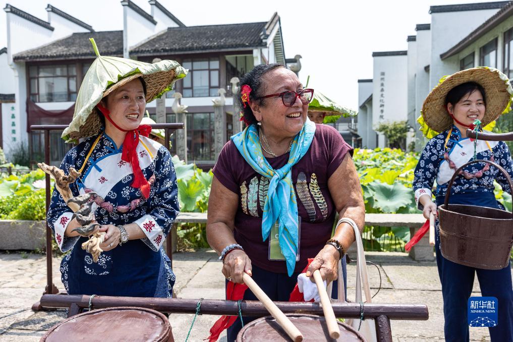 8月6日,在浙江省湖州市南浔区和孚镇荻港渔庄,外国友人体验水乡特色民俗乐器。
