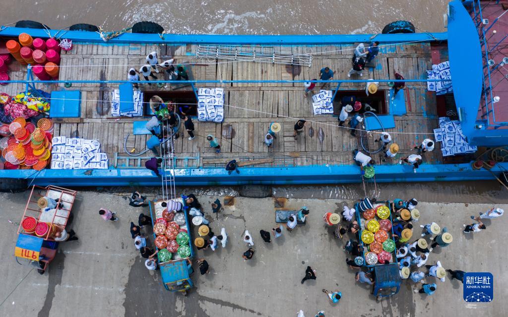 8月7日首批开渔归来的渔运船靠泊在舟山普陀沈家门舟山国际水产城码头,吸引了大批海鲜批发商前来选购新鲜的梭子蟹等渔获(无人机照片)。