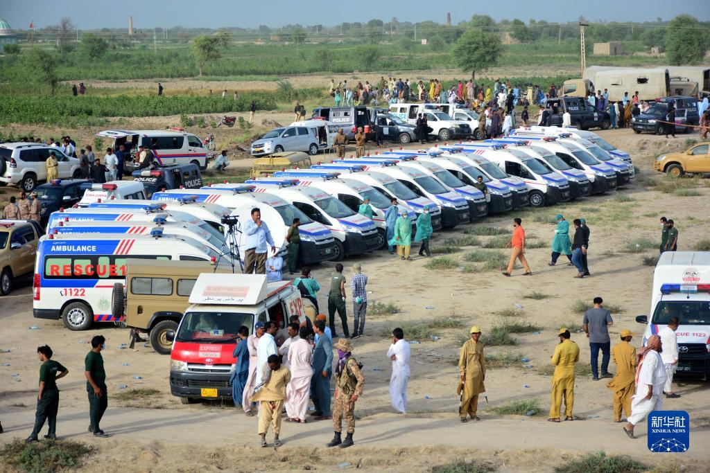 8月6日,多辆救护车停在巴基斯坦南部信德省桑克尔地区的列车脱轨事故现场附近。