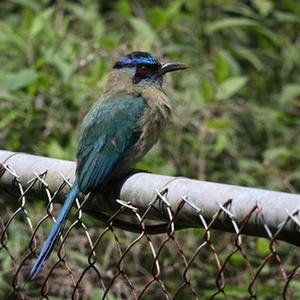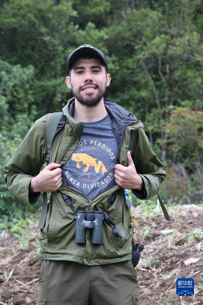 7月23日,哥斯达黎加蒙特韦德云雾森林生物保护区的一名导游展示他身穿的印有金蟾蜍纪念图案的T恤衫。