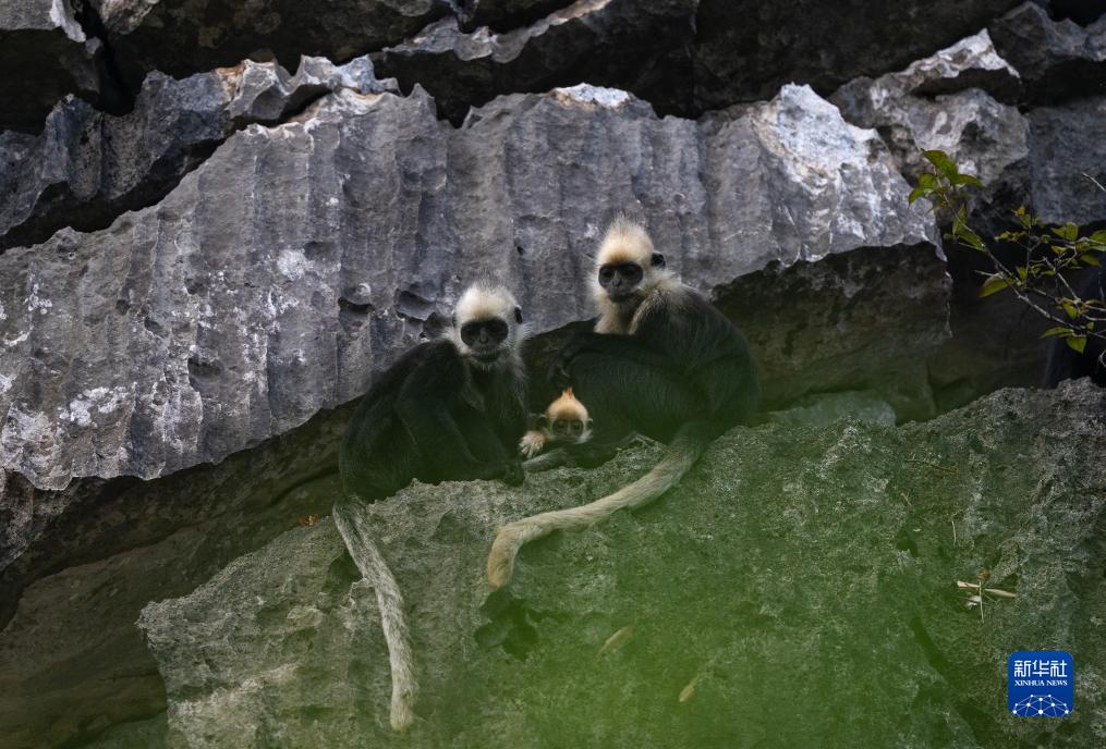 8月5日清晨,两只母猴保护着一只小“金猴”。幼猴浑身金毛,被人们称为“金猴”。