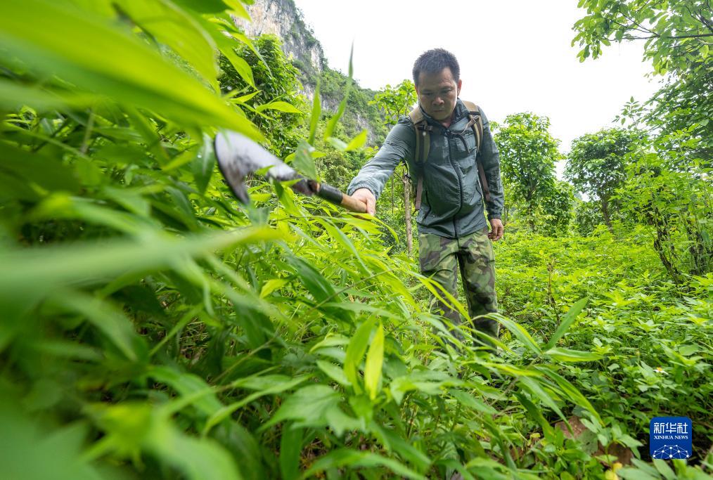 8月4日,梁志章在保护区巡视时用砍刀开路。