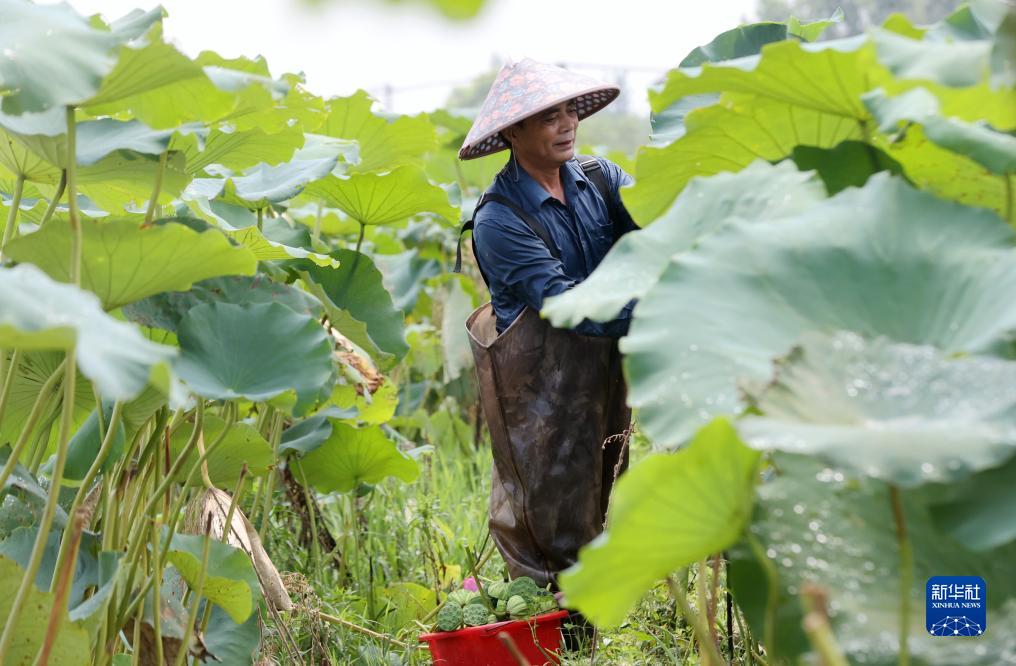 8月8日,浙江省湖州市德清县康乾街道新琪村村民在荷田中采摘莲蓬。