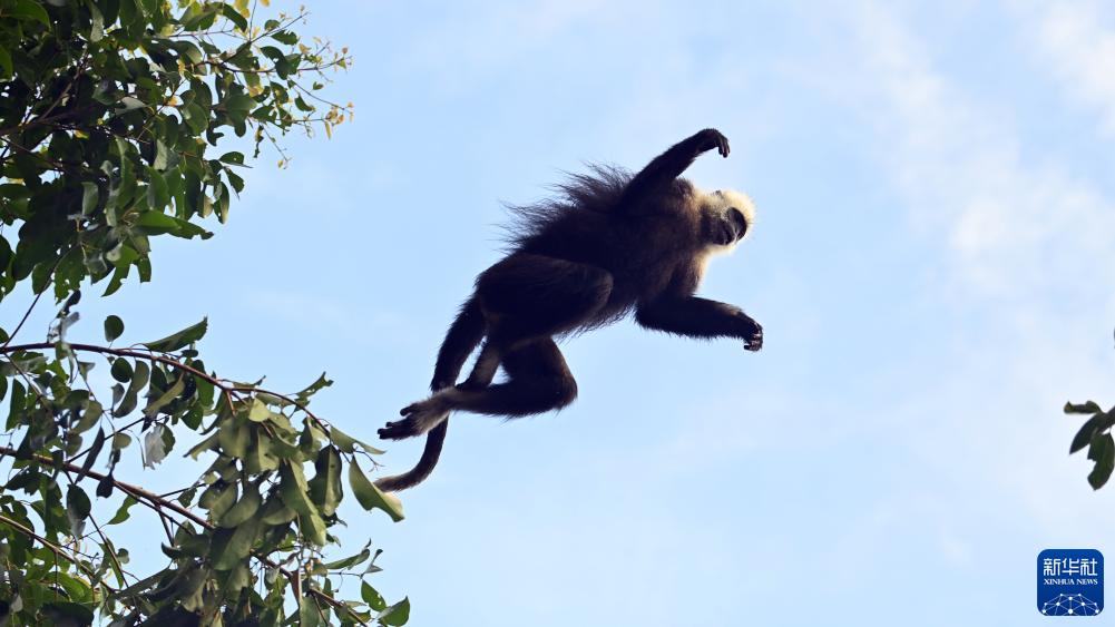 在崇左市江州区罗白乡的白头叶猴国家级自然保护区,白头叶猴在林间飞跃(8月5日摄)。