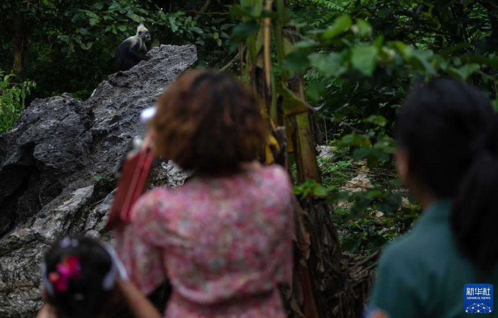 8月5日,在崇左市江州区罗白乡的白头叶猴国家级自然保护区,游客在观看一只白头叶猴。