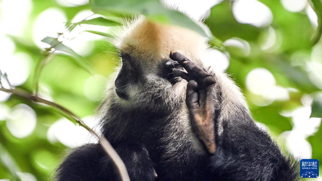 在崇左市江州区罗白乡的白头叶猴国家级自然保护区,一只白头叶猴在“掏耳朵”(8月4日摄)。
