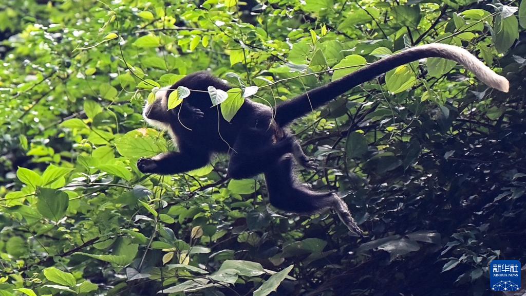 在崇左市江州区罗白乡的白头叶猴国家级自然保护区,白头叶猴在林间飞跃(8月5日摄)。