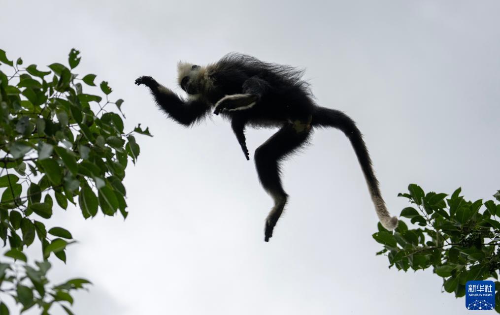 在崇左市江州区罗白乡的白头叶猴国家级自然保护区,白头叶猴在林间飞跃(8月5日摄)。