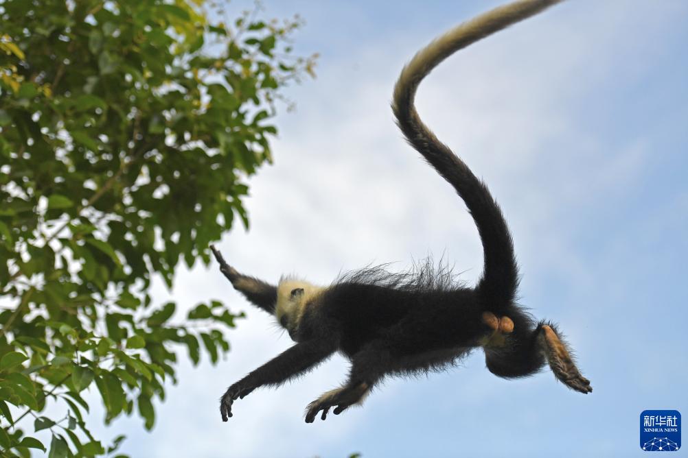 在崇左市江州区罗白乡的白头叶猴国家级自然保护区,白头叶猴在林间飞跃(8月5日摄)。