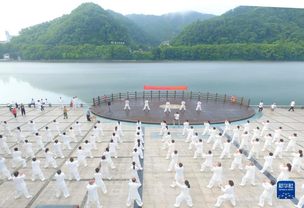 8月8日,在浙江省建德市新安江畔的江滨公园,市民在练习太极拳(无人机照片) 。