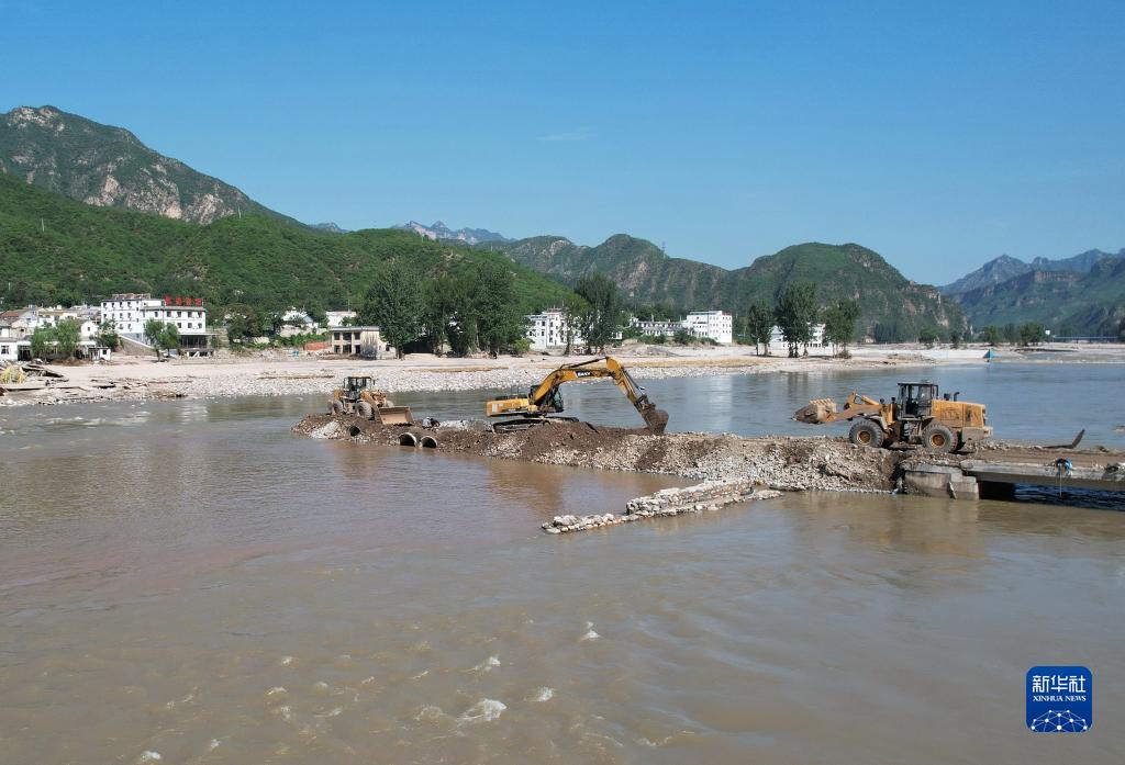 8月8日,工人操作机械设备抢修通往涞水县三坡镇上庄村的桥梁(无人机照片)。
