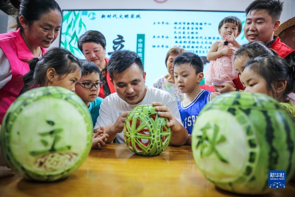 当日,浙江省湖州市长兴县画溪街道在姚家村文化礼堂开展“多彩民俗迎立秋”主题活动,通过“瓜上雕刻”、“啃秋”吃西瓜、悬秤称重等趣味活动,让孩子们体验传统民俗,了解节气的相关知识。