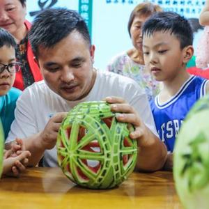 8月8日,在姚家村文化礼堂,非遗传承人在教孩子们“瓜上雕刻”。