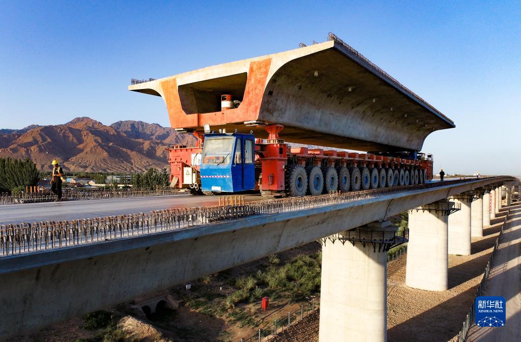 8月8日拍摄的包银高铁跨白彦花铁路专用线特大桥箱梁架设施工现场(无人机照片)。