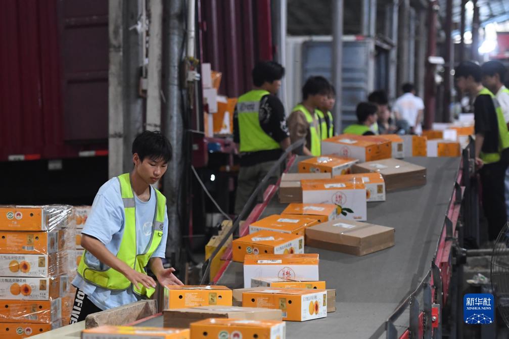 8月8日,工作人员在一家物流企业炎陵黄桃项目营业点将黄桃装车。