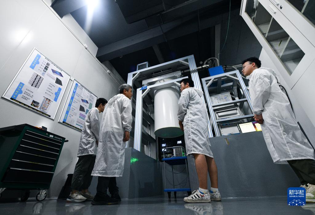 7月22日,在位于上海张江的上海量子科学研究中心,彭承志(左二)和团队成员在“祖冲之二号”前讨论研究进展。