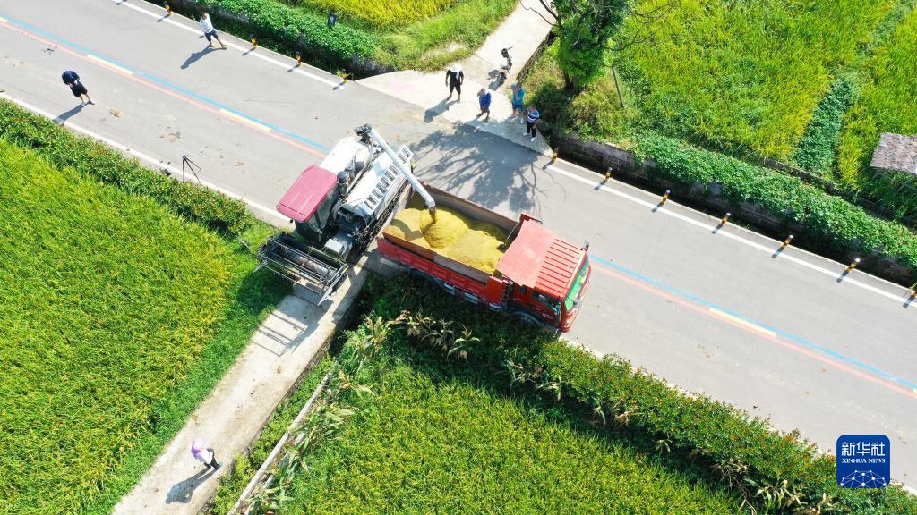 8月8日,在重庆市梁平区安胜镇,收割机将收获的稻谷装上卡车(无人机照片)。