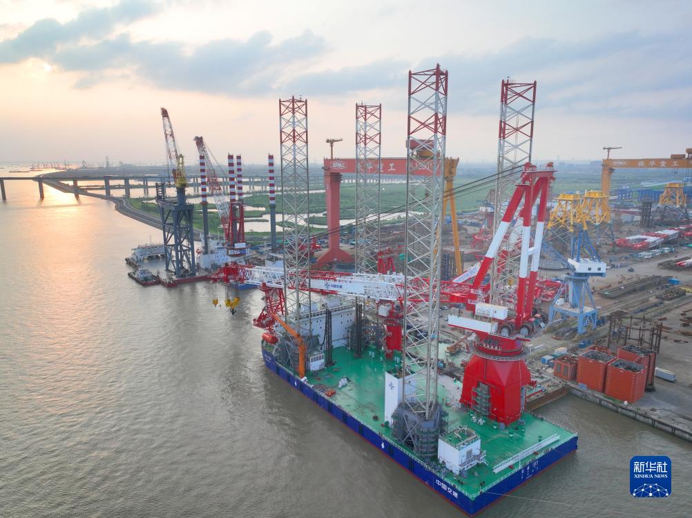 该风电安装平台长133.8米,型宽50米,型深11米,总重约28000吨,艉部右舷设2500吨绕桩式全回转起重机,适用于砂性土、粘性土或类似地质作业,主要用于15兆瓦及以上机组设备安装,可同时运载2套15兆瓦风机机组设备,最大作业水深70米。新华社发(许丛军 摄)