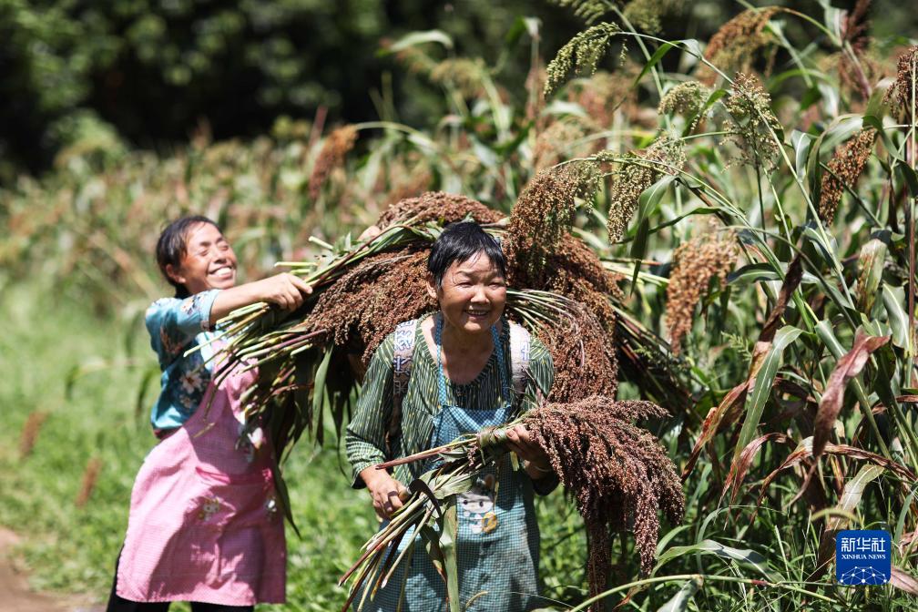 近日,贵州省赤水市种植的高粱喜获丰收,村民们抢抓晴好天气忙着采收、晾晒高粱。近年来,赤水市积极调整农业产业结构,驻村党员干部引导农民种植酿酒高粱,采取“党支部+合作社+农户”模式,统一提供种子、有机肥和种植技术,实行订单保底价格收购,促进农业增效、农民增收,助力乡村振兴。