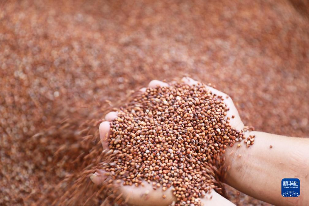 近日,贵州省赤水市种植的高粱喜获丰收,村民们抢抓晴好天气忙着采收、晾晒高粱。近年来,赤水市积极调整农业产业结构,驻村党员干部引导农民种植酿酒高粱,采取“党支部+合作社+农户”模式,统一提供种子、有机肥和种植技术,实行订单保底价格收购,促进农业增效、农民增收,助力乡村振兴。