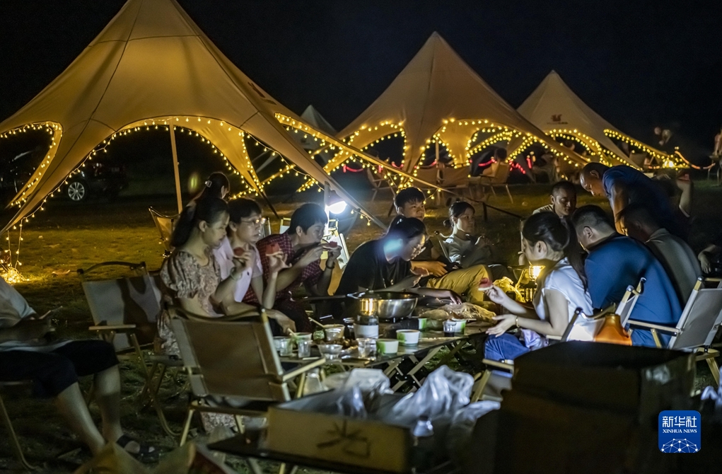 8月8日,在海南省琼海市龙江镇南正村,市民和游客在万泉河畔露营纳凉。