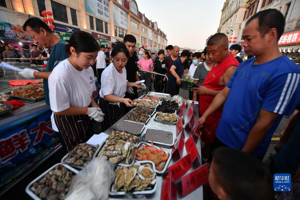 8月6日晚,在山东省青岛市城阳区举行的首届青岛国际海鲜节活动上,游客在选购各式海鲜。