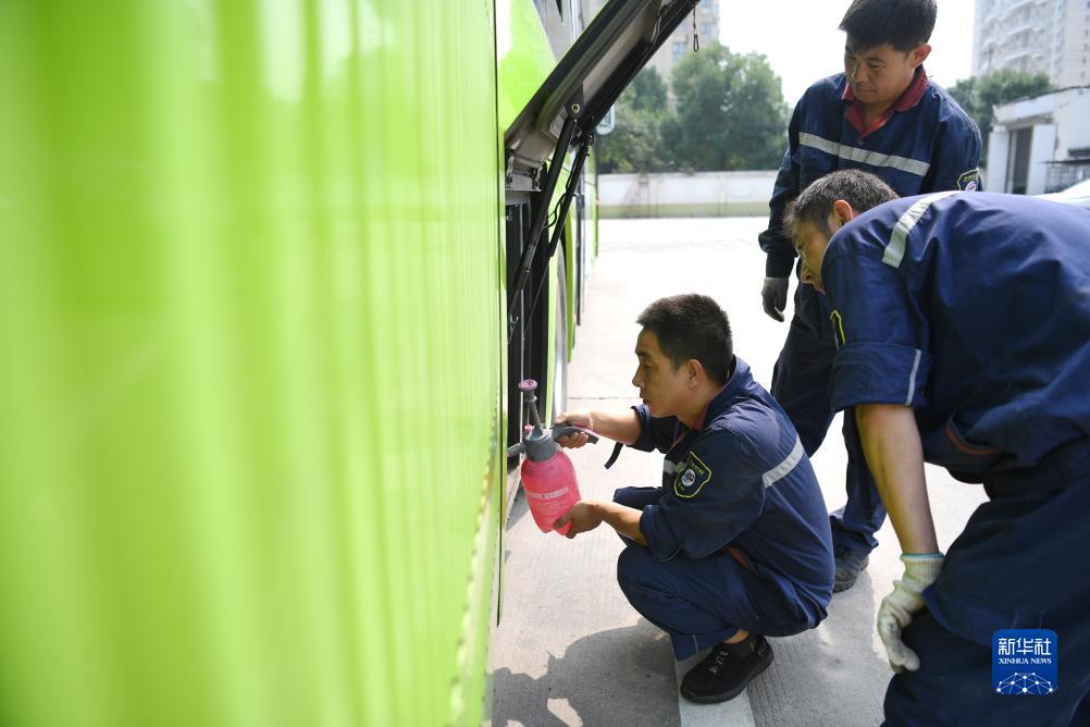 8月9日,河北省涿州市838路公交总站工作人员对车辆进行养护。