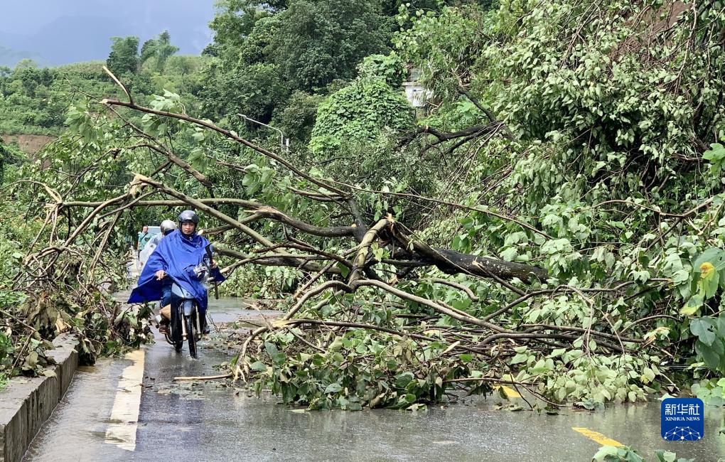 8月8日,在越南高平省,人们骑摩托车行驶在受灾道路上。