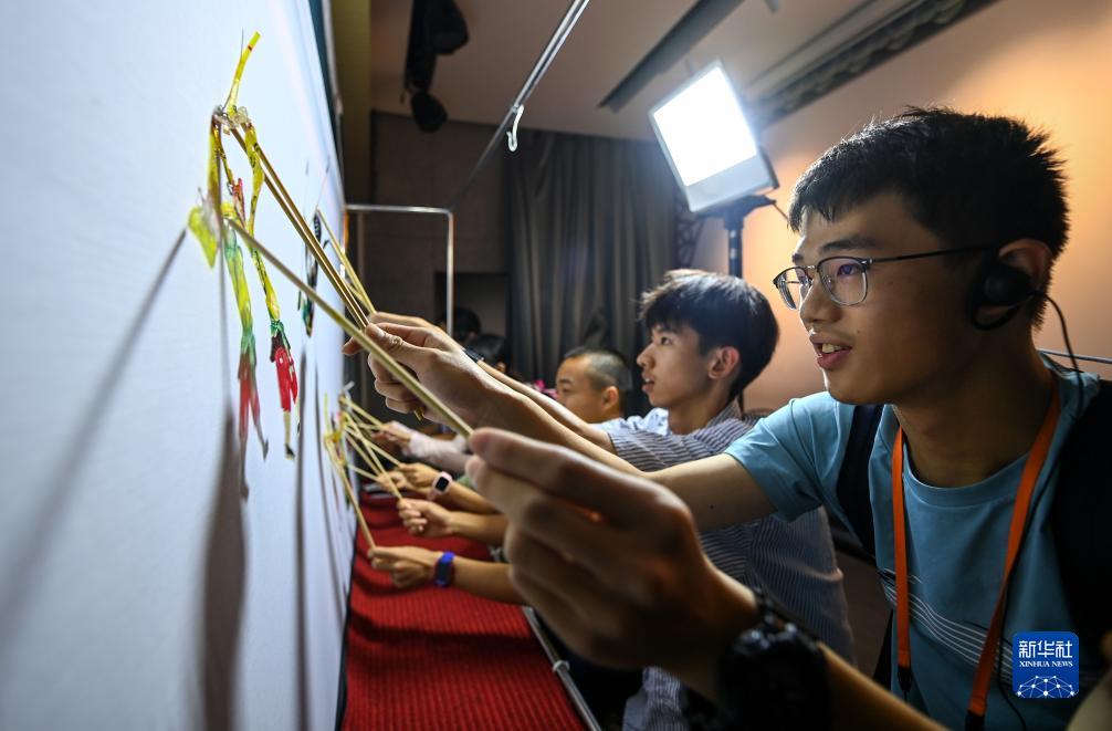 暑期研学的学生在中国秦腔艺术博物馆里体验皮影戏演出(8月8日摄)。