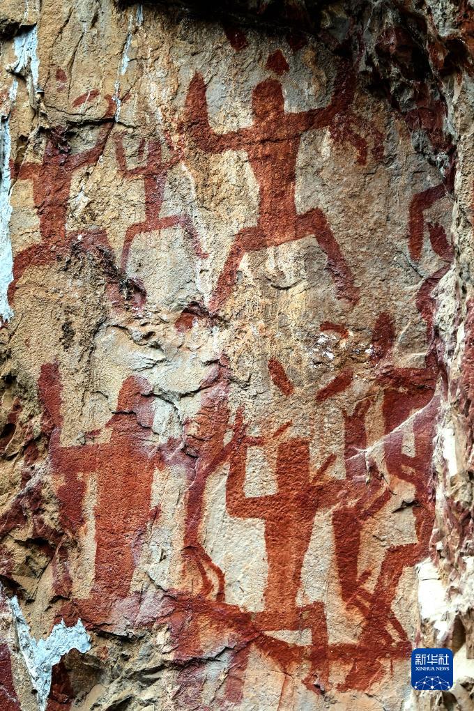 这是广西崇左市宁明县的花山岩画 ,画面仿佛一个个“跳舞的小人”(8月8日摄)。