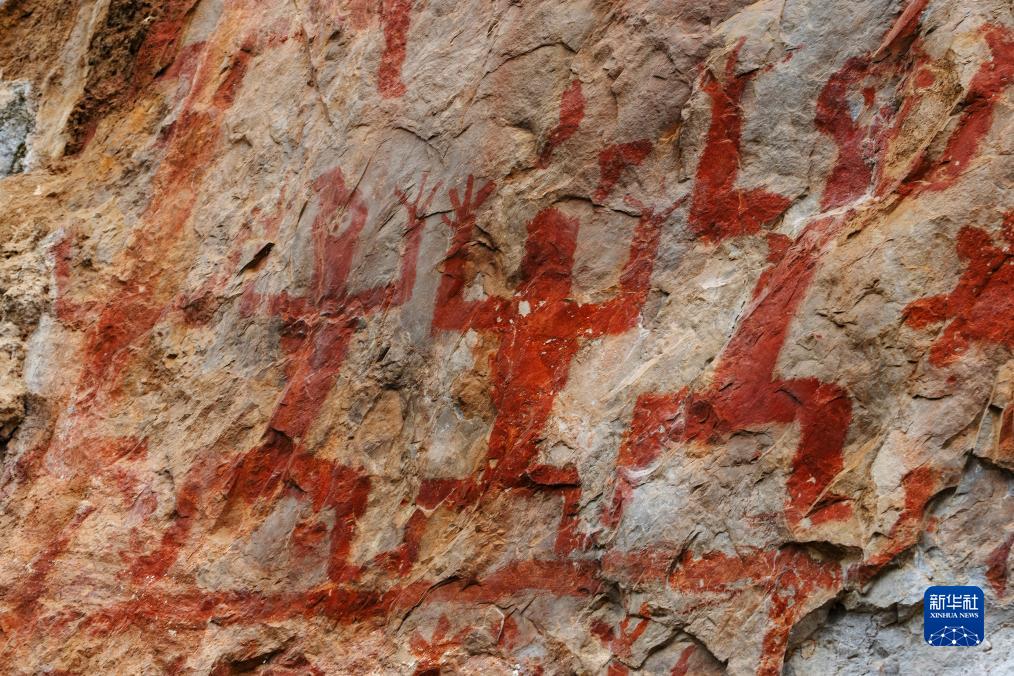 这是岩画局部,画面右一和左二为戴着面具的祭司(8月8日摄)。