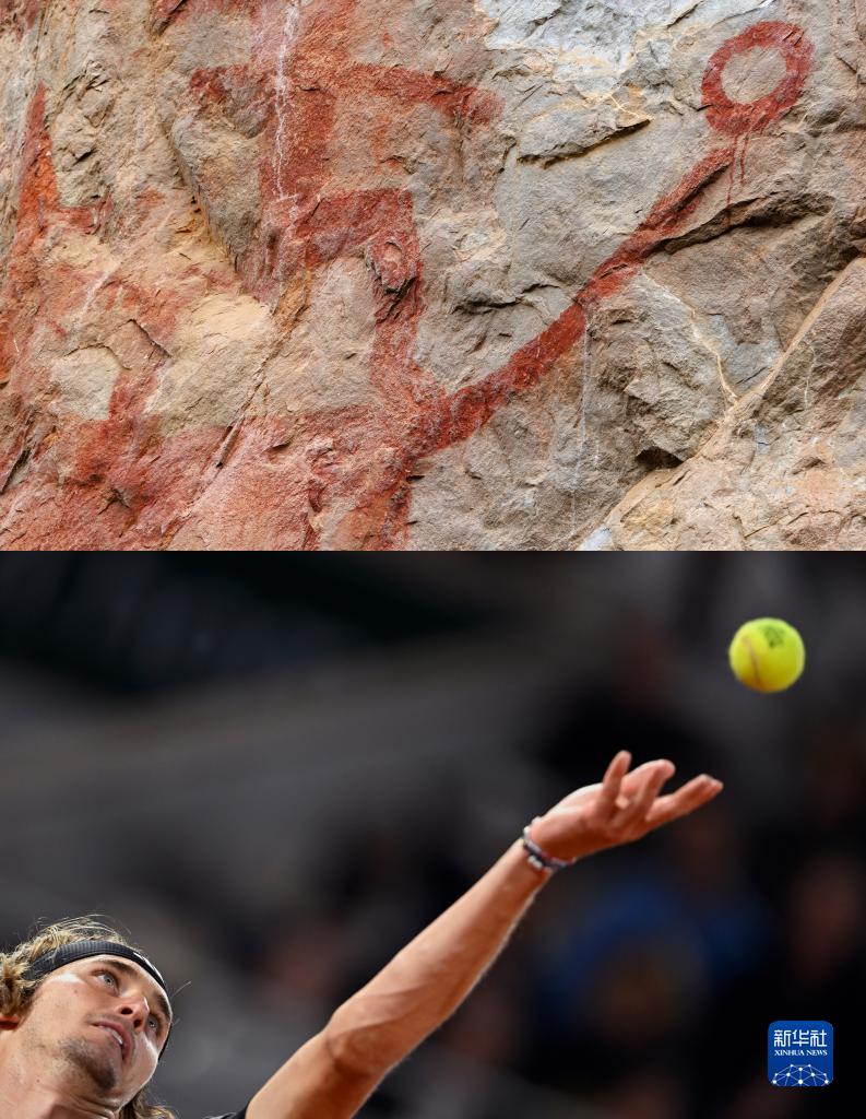拼版照片,下图为网球发球的资料照片;上图为花山岩画中看上去很像网球发球的图像(8月8日摄,新华社记者费茂华摄)。