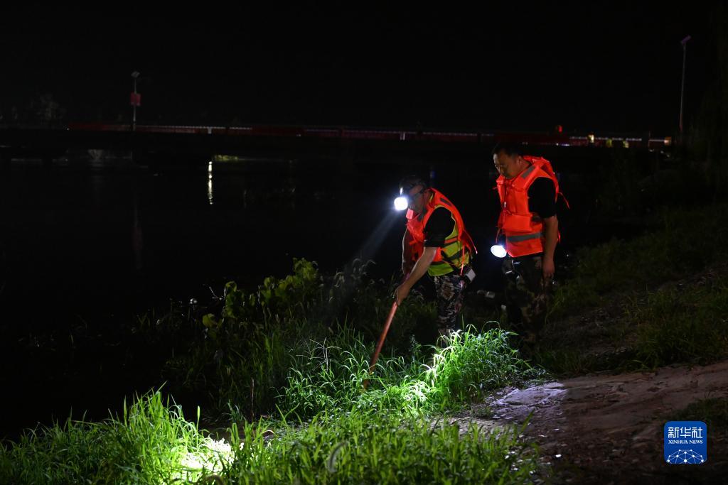 在天津市静海区大清河台头段北堤,村干部及留守人员夜巡河堤(8月7日摄)。