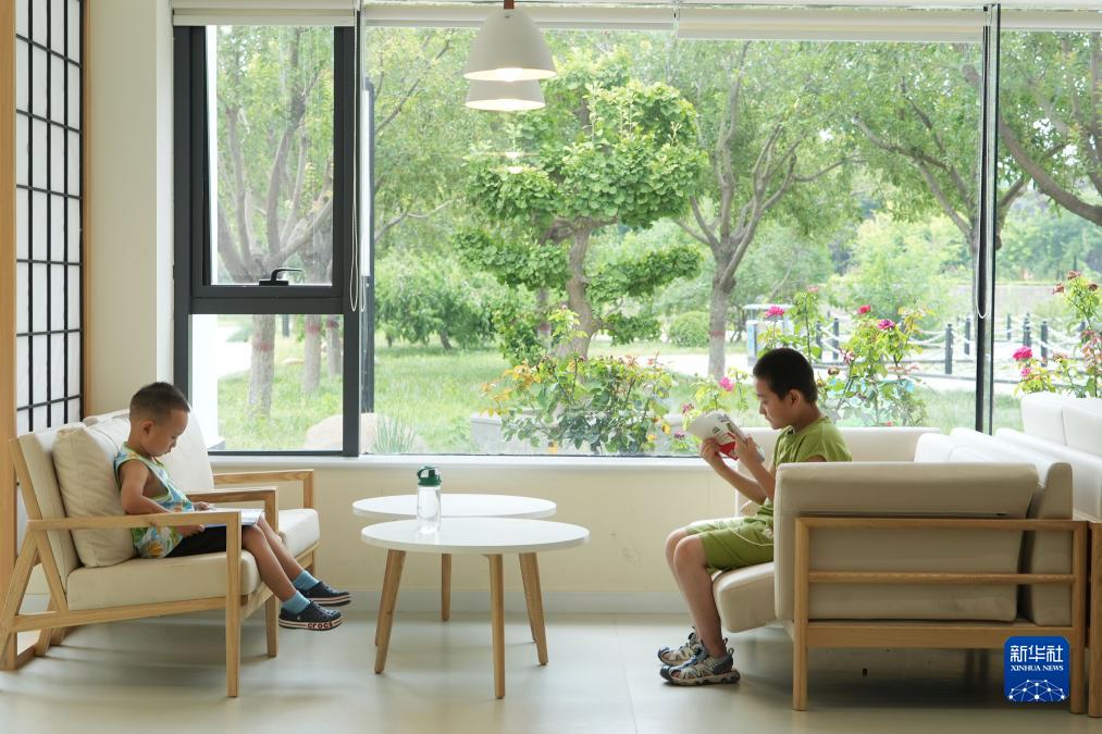 8月9日,小朋友在河北省石家庄市花卉园内一处公园书房阅读。
