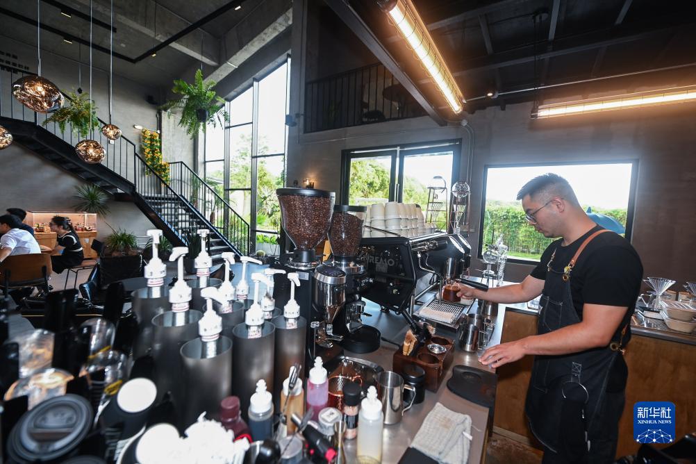 8月9日,在宁波市镇海区庄市街道永旺村的“野与望乡村青创集”特色街区的咖啡屋内,店员在做咖啡。永旺村通过盘活农村闲置农田和农房,完善“农业+”乡村旅游产业链,并引入科创文创产业,打造集零售、餐饮、休闲等服务功能于一体的特色商业街,不断丰富乡村业态,走出一条独具特色的共富新路子。