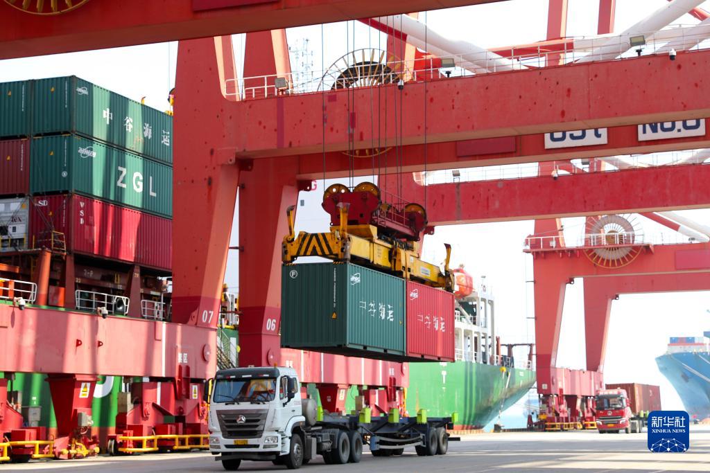 8月10日,在山东港口青岛港,集装箱货车在装载货物。