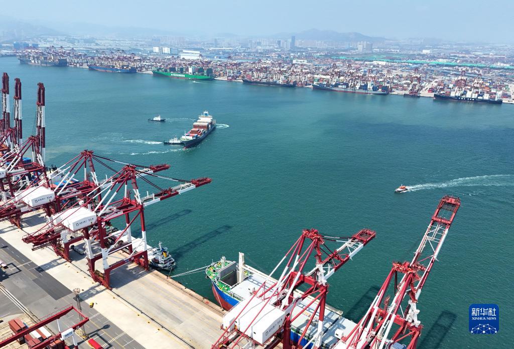 8月10日,在山东港口青岛港,一艘货轮缓缓离泊(无人机照片)。
