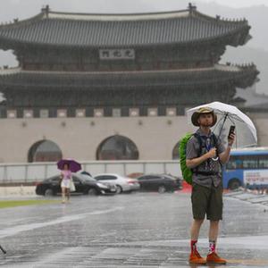 受台风“卡努”的影响,韩国多地出现强风暴雨天气。受恶劣天气影响,部分航班和列车被取消或延误。