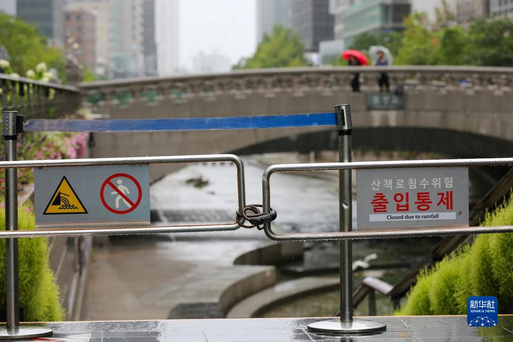 8月10日,受台风影响,韩国首尔清溪川沿河步道入口处限制通行。