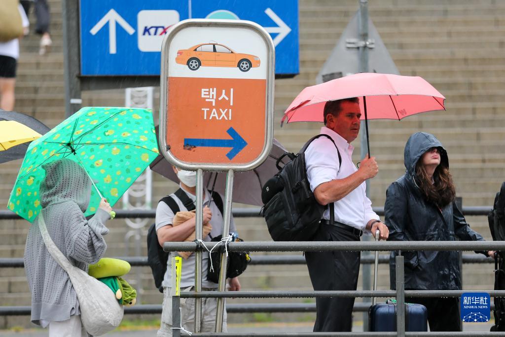 8月10日,在韩国首尔站外,人们在雨中排队等出租车。