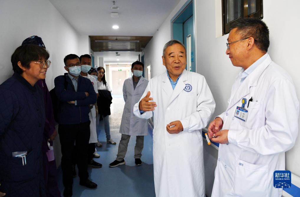 8月10日,中国科学院院士、首都医科大学附属北京天坛医院神经外科学中心主任医师赵继宗(右二)和西藏第二人民医院的医生在医院病房走廊里交流。