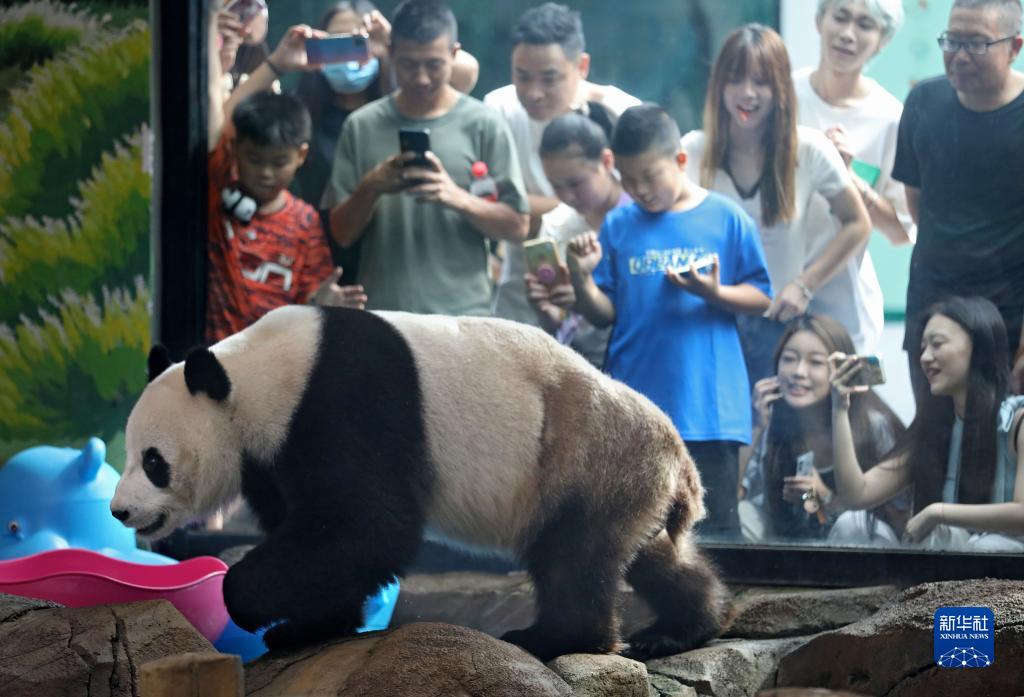 8月11日,大熊猫“刚刚”在鞍山动物园熊猫馆里散步休闲。