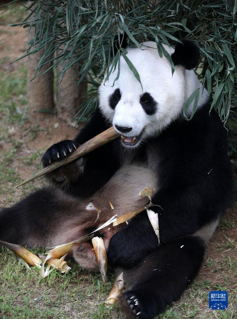 8月11日,大熊猫“刚刚”在鞍山动物园熊猫馆室外吃鲜竹笋。
