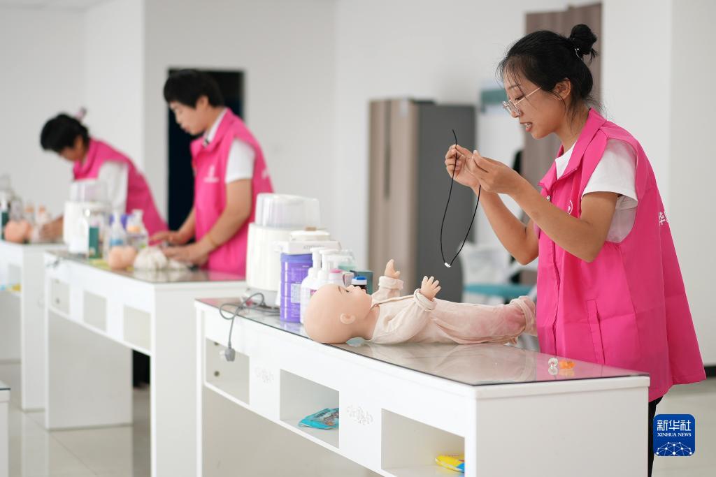 8月11日,在河北省沧州市新华区巾帼家政服务技能大赛比赛现场,参赛人员展示育婴技能。