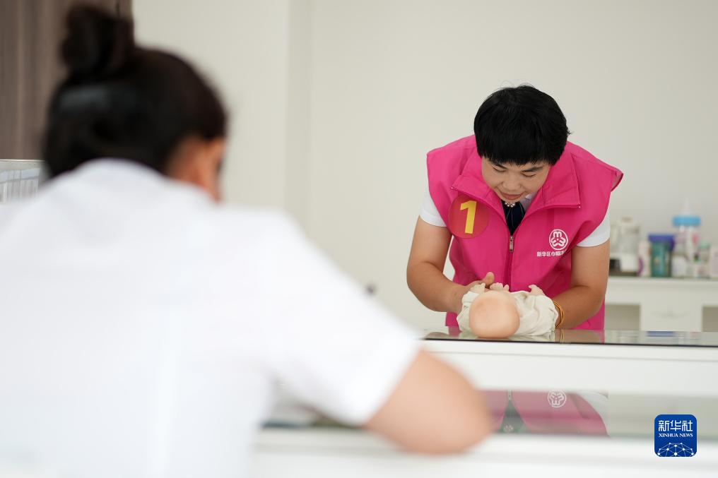 8月11日,在河北省沧州市新华区巾帼家政服务技能大赛比赛现场,参赛人员展示育婴技能。