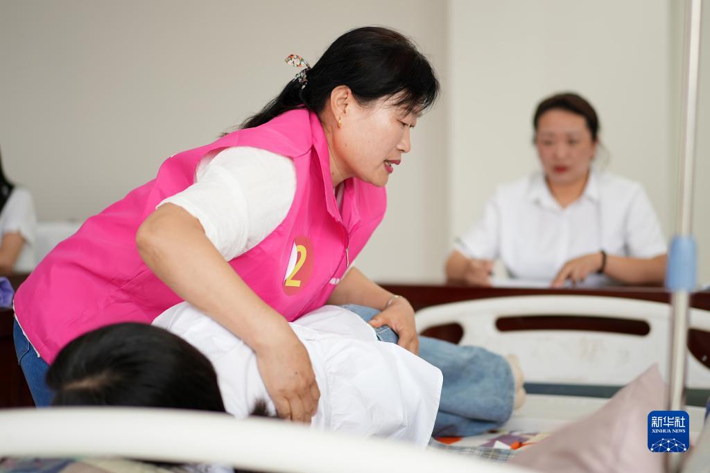 8月11日,在河北省沧州市新华区巾帼家政服务技能大赛比赛现场,参赛人员展示养老护理技能。