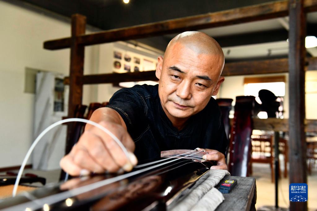 8月10日,在枣庄市市中区传统古琴制作非遗工坊,非遗传承人谢爱军在制作古琴。
