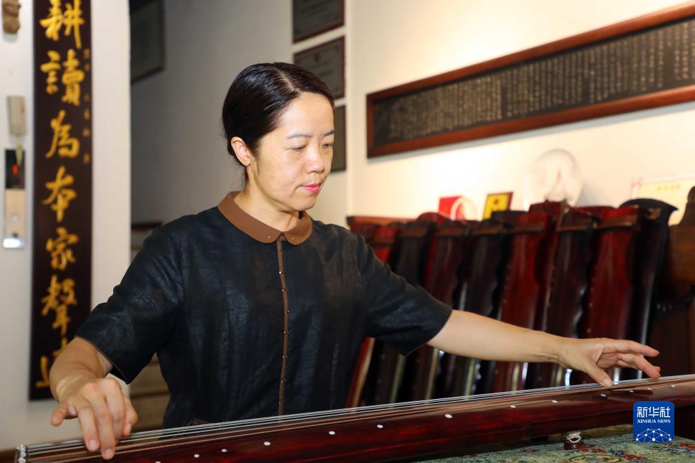8月10日,在枣庄市市中区传统古琴制作非遗工坊,非遗传承人王新娟在调试古琴。